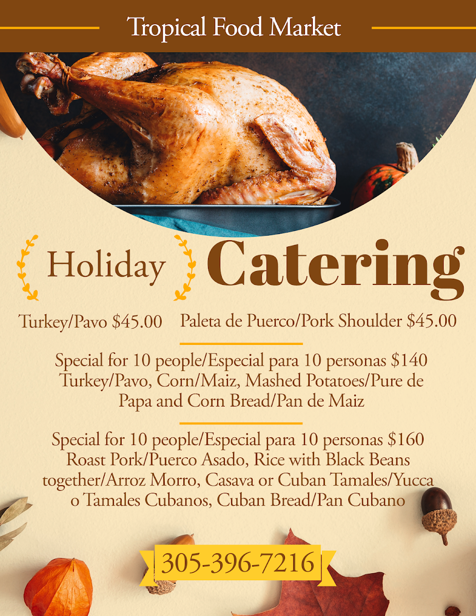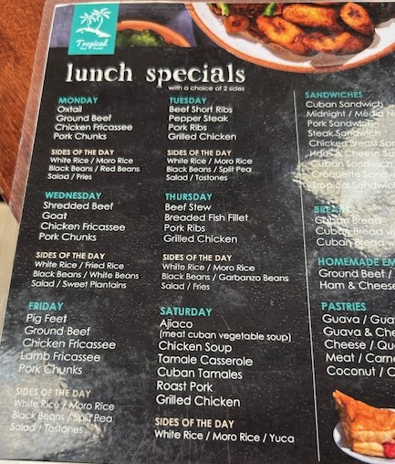 The Tropical Food Market (Cuban Restaurant) Menu offers a vibrant taste of Cuba right in the heart of Key West, Florida. Nestled at 5636 3rd Ave, this charming spot brings the island’s rich culinary heritage to life with every dish. The menu features a tantalizing variety of Cuban classics, from perfectly seasoned ropa vieja to the ever-popular lechón asado, slow-roasted to perfection. Fresh ingredients take center stage, with bold flavors in every bite, whether you’re enjoying the savory tastes of Cuban sandwiches or the zesty crunch of a classic Cuban salad.